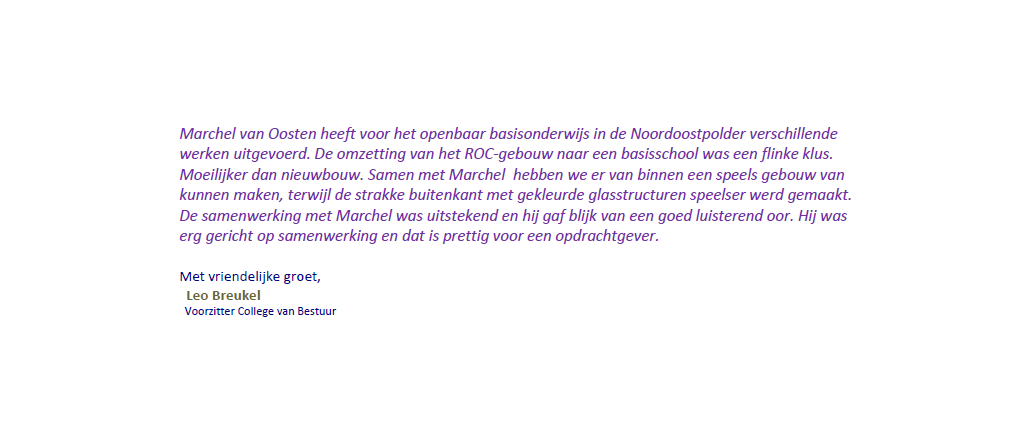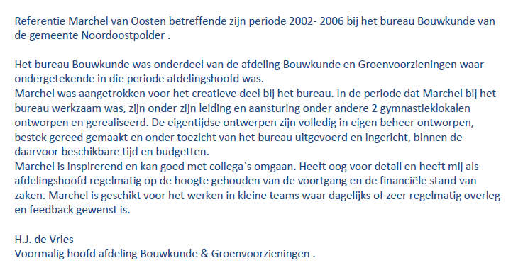Harry de Vries was the former head of the department of architecture and green facilities at the municipality of Noordoostpolder. In this reference, he describes Marchel as a professional and reliable architect who is a great team player having a good eye for detail.