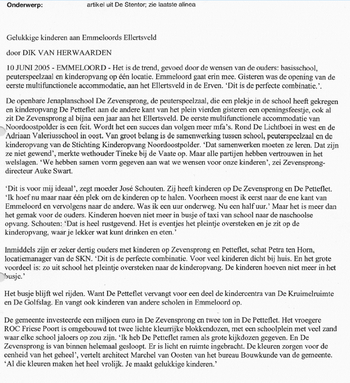 This article from the Stentor describes the new school and childcare center in Emmeloord. The article even mentions the, consciously chosen, colorful and playful design of the schools. Which should make the school and childcare center a fun and inspiring place for the children.